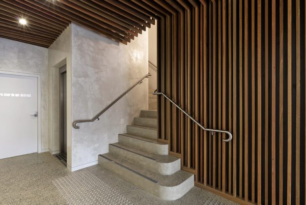 This building was a typical two storey retail outlet with a heritage listed façade to the Corso and underutilised first floor and Rialto lane frontage. BJA obtained approval to construct commercial tenancies on the first and second floors with access from new lobby and lift off the lane. The lobby features an undulating timber batten ceiling and wall contrasting with an eggshell rendered wall finish opposite.