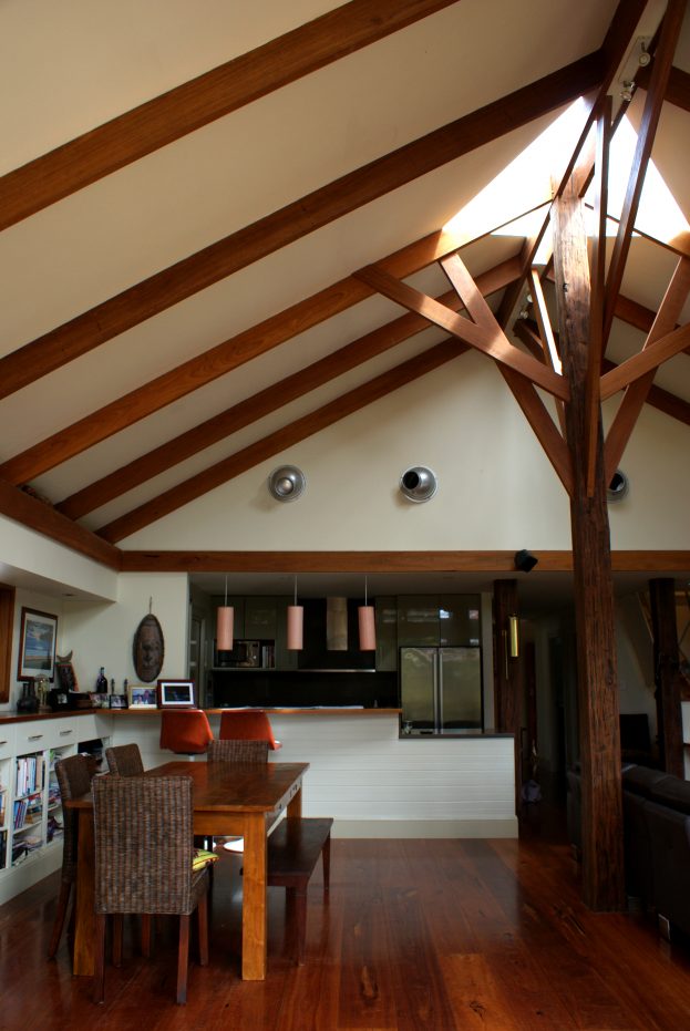 Large recycled hardwood wharf timbers were used in this renovation by an owner who is also a practicing builder. The design creates generously proportioned north-facing kitchen, dining and living area at the rear of the house.