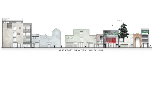 This laneway behind the Corso in Manly has undergone a transformation from a garbage and delivery service lane to a paved shared pedestrian laneway. The catalyst has been BJAs development of new 3 storey commercial offices with entry lobby’s along Rialto lane.