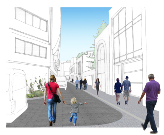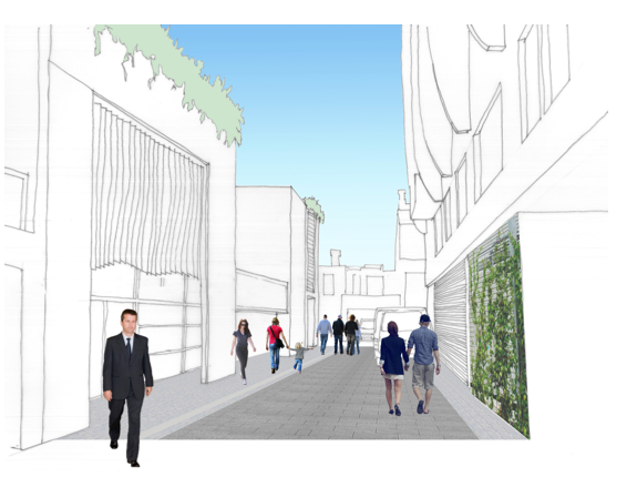 BJA’s strategy is to limit vehicles, slow traffic movement and loading times and to articulate pavement patterns for pedestrian safety. We lobbied to replace loading docks with people active frontages and improve the quality of building uses and facades. Still to come are green walls and a café courtyard!
