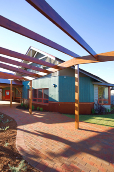 Substantial progress has been made with creative landscaping and the gestures and colours of the new classrooms and kindergartens. A membrane shade canopy over a timber stage helps break the rigidity of the old corner and provides an al fresco performance space for the whole school. It is a good example of how in the absence of natures’ vital forces, an artistic design approach can be uplifting to the spirit.