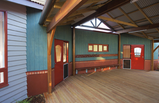 The two kindergarten rooms (BER funded) are oriented across the site and share a generous entry verandah, which becomes an “outdoor covered playroom”. The building needed to sit comfortably in a suburban streetscape whilst connecting to the main campus at the rear. Each room has a bay window “stage” as well as kitchen, craft and movement areas.